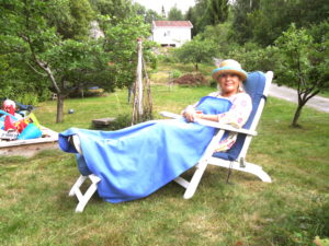 Här repeteras en scen med Linus och Henrik, som spelar mina svärsöner. Och Emma, som spelar min dotter. Jacob regisserar medan Mamma = jag somnar i solstolen.