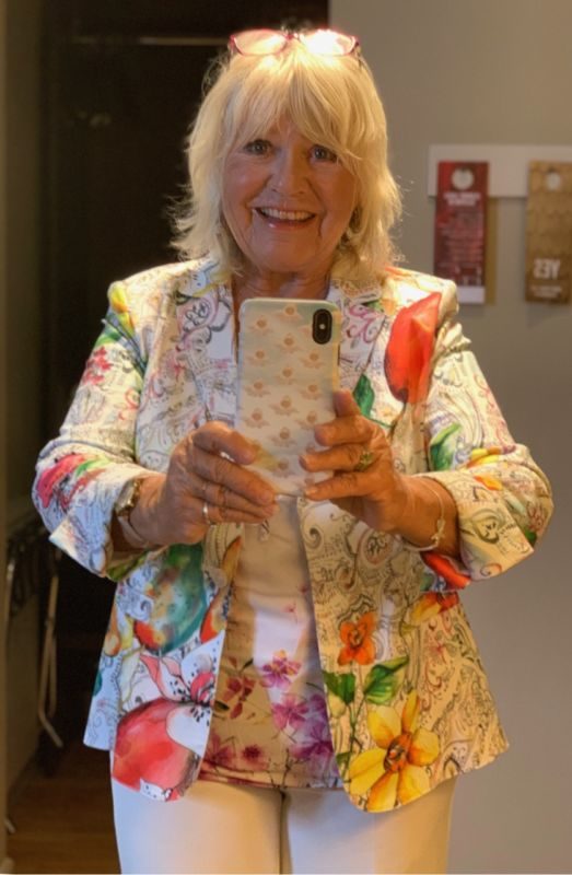 Dagens outfit ur Klingel-sortimentet: Vita byxor, vit blus med blommor och en härlig färgglad kavaj att ha på mig på Klingel-eventet.