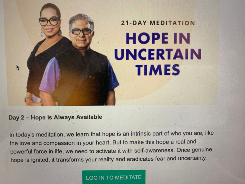 Welcome to the 21-Day Meditation Experience, Hope in Uncertain Times. We are honored you’re joining us as part of the #HopeGoesGlobal movement. As we meditate each day together, we’ll find peace of mind in the midst of turmoil, and help our global community find hope and optimism. Bring a friend and share the power of meditation.
