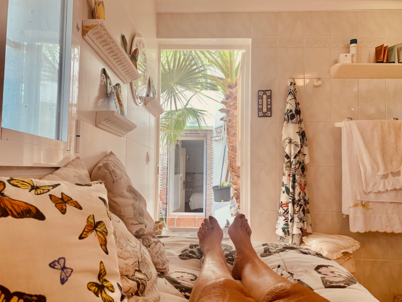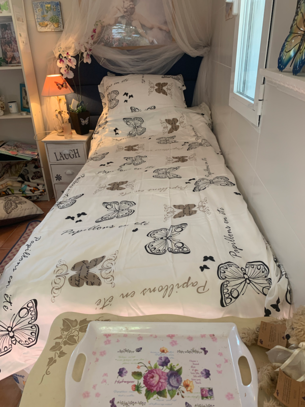 HITTADE EN BÄDDMADRASS OCH ETT PÅSLAKAN OCH ÖRNGOTT MED FJÄRILAR TILL MITT NYINREDDA LILLA HUS. DET ÄR ETT AV MINA PROJEKT SOM JAG SYSSELSATT MIG MED UNDER CORONA-KARANTÄNEN HÄR I NERJA.