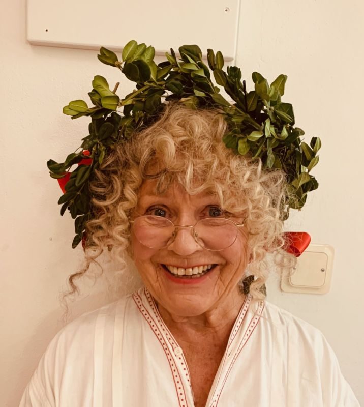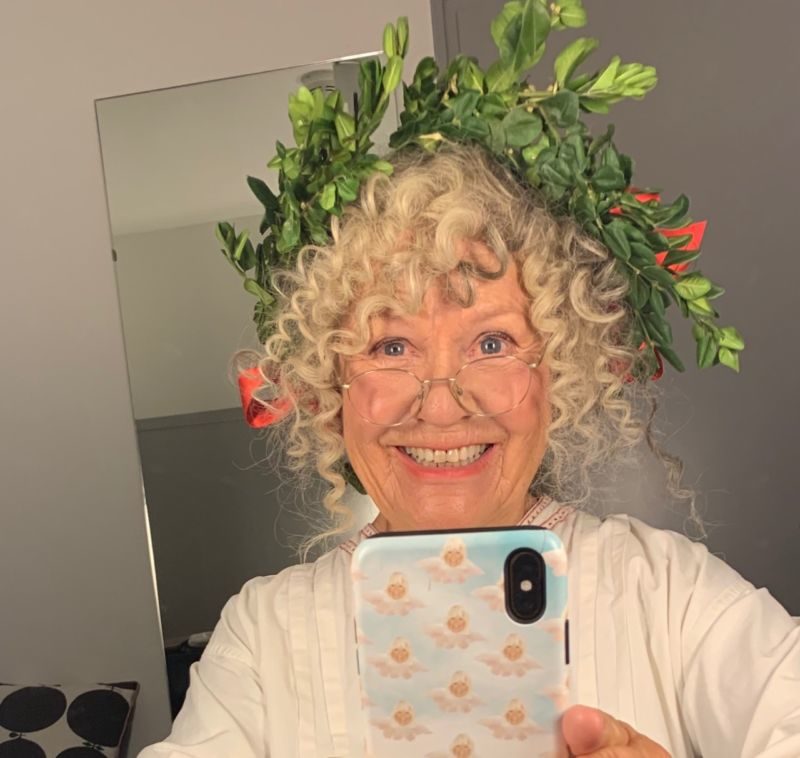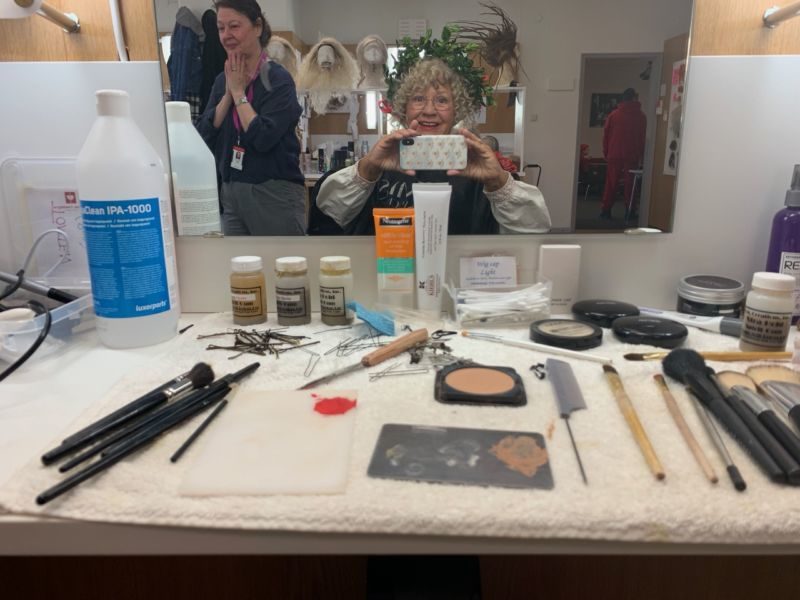 Här sitter jag i smink-logen och får en krans i håret för att spela in en scen där jag kommer hem till Tomte-familjen och "lussar".