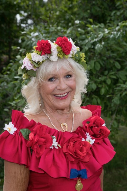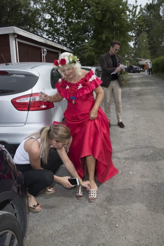 ........ som hon sedan bättrade på innan det var dags för fotografering. Så fick jag en blomsterkrans i håret - Jessica hjälpte mig med klänningen, som jag dagen till ära dekorerat med min Kunga-medalj.: "Litteris et Artibus"....