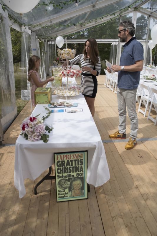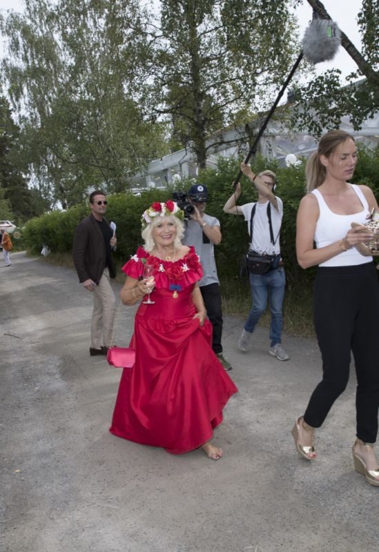 Käre Johan Pråmell - producent för Wahlgrens värld - eskorterade mig tillbaka till tomten för att där välkomna övriga gäster............ då hade skorna åkt av, och jag fortsatte festen barfota.