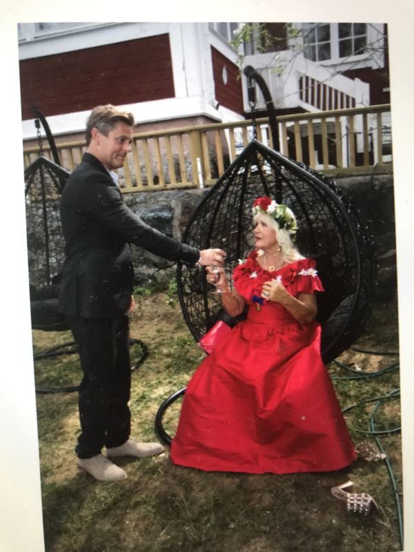 Niclas tyckte att hans mamma behövde ett glas skumpa - när hon provade sin present från Silkflower: En "Snurr-stol", som jag önskat mig så!