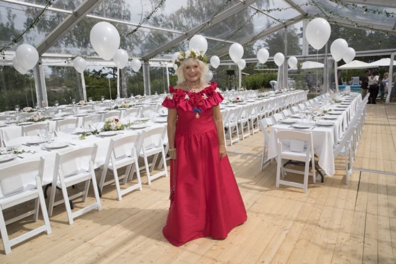 Här eskorteras jag av Sophie .........min "assistent" - och "Fest-fixare" - som har varit till stor hjälp med kontakter med tältfirman och buss-firman m.m. Utan all hjälp från henne och duktiga tjejer: Ulrika och hennes catering-tjejer - och tjejerna från Doomie Design, som dekorerade tältet - hade jag aldrig kunnat genomföra denna fantastiska FEST.