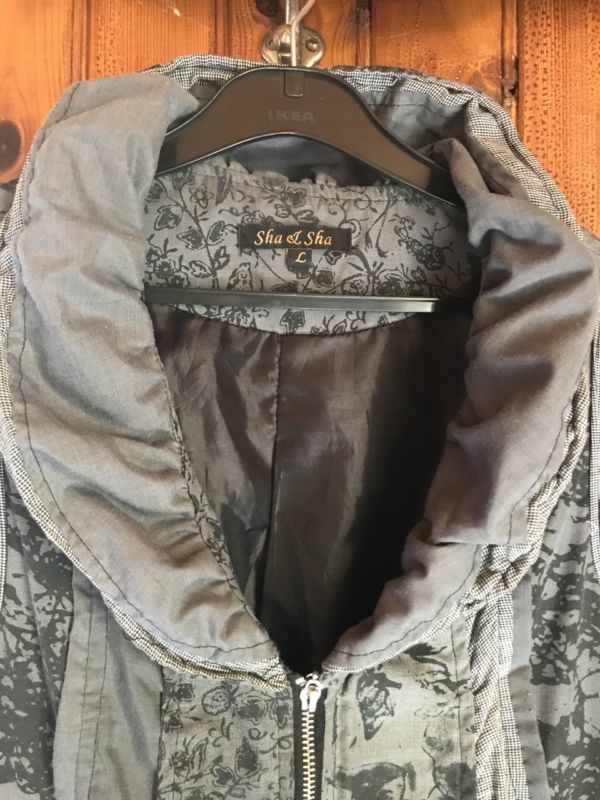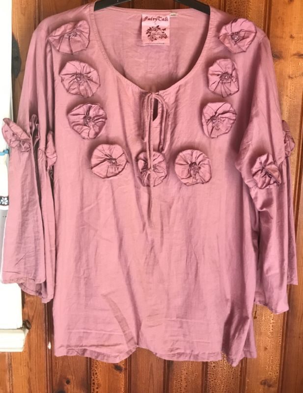 BLUS NR 25. LILA MED BLOMMOR. STORLEK 38. PRIS: 120:-
